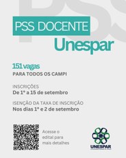 Para mais informações acerca do PSS para contratação de professores temporários, leia o edital ou acesse o site unespar.edu.br/concursos. Em casos não contemplados pelo documento, entre em contato pelo e-mail cpps.reitoria@unespar.edu.br.